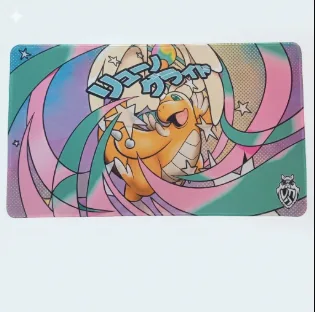 Lo que hace especial a este tapete es su estética de «arte pop» y fantasía. Dragonite aparece rodeado de ráfagas de colores rosa, turquesa y violeta, adornado con estrellas brillantes que resaltan su naturaleza majestuosa. La tipografía en japonés en la parte superior le da ese toque de autenticidad «oriental» que tanto buscan los coleccionistas.